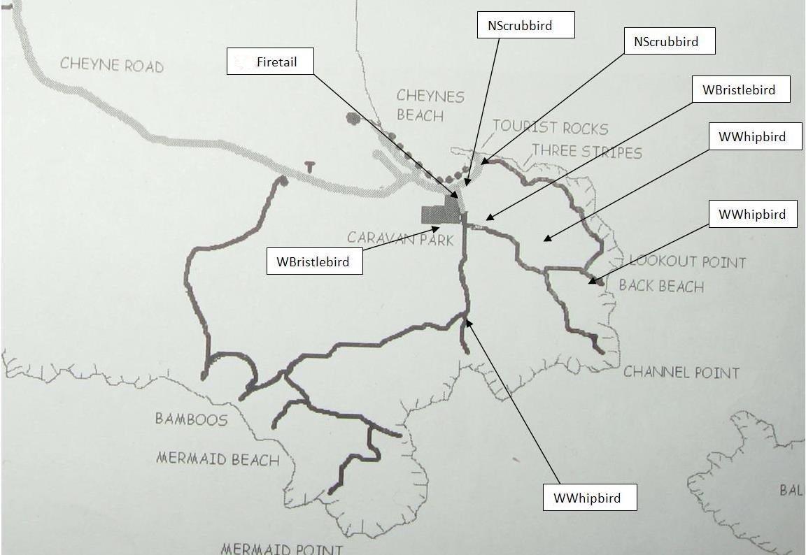 We saw Western Bristlebird at Cheynes Beach immediately east of the Bald Island Rd, about 100 metres south-east of the turn-off to the Caravan Park (60 metres after the road becomes a dirt track). From the Caravan Park entrance travel south for 50 metres past the Caravan Park entrance and then take the easterly track for about 20 metres (see map below).