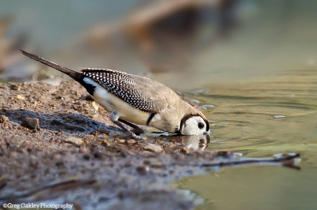 All up we spent several days at Cumberland Dam, once on the way through to Karumba, and once on the way back to Cairns. In terms of seeing finches, we found that the most productive dam – in terms of birds coming in for their morning drink – was not the main dam but the smaller dam immediately to the west (-18.29905,143.349211) – sometimes called West Cumberland Dam. At this dam several mid-sized shrubs acted as a protective vantage point for the finches and honeyeaters to roost upon just before coming down to drink. The finches would land on the ground on the north-east side of the dam, feed on grass seeds, then fly to the shrubs in preparation for drinking. At one point we had six species of finch roosting in these over-hanging shrubs – Zebra, Double-barred, Black-throated, Masked and Plum-headed Finch and Chestnut-breasted Mannikin! Does it get any better than that! Well possibly! Greg and I had our fingers crossed in the hope of seeing Gouldian Finch or Pictorella Mannikin. Unfortunately, on this trip, it was not to be.