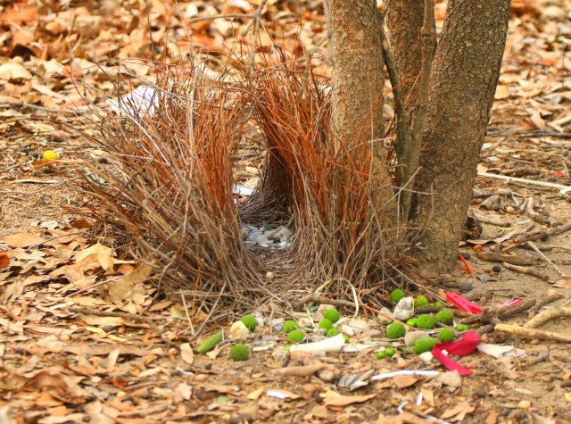 | A Great Bowerbird’s bower. There are several bower around Cumberland Dam, including one immediately in front of our campsite. |