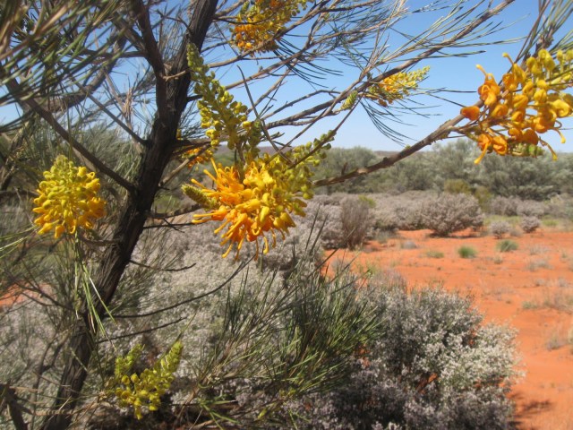 Umbrella Bush (Acacia ligulata) – Watarrka is the Luritja name for this plant -, the spectacular Flame (or Honey) Grevillea (Grevillea eriostachya) and Honeysuckle Grevillea (Grevillea Juncifolia), both dripping with nectar, Holly (or Wickham’s) Grevillea (Grevillea wickhamii), Cassia (Senna Artemisioides), Desert Hop-bush (Dodonaea viscosa) and there three kinds of Spinifex, known by local Aboriginal communities as Tjanpi – Soft Spinifex (Triodia pungens), Hard Spinifex (T. basdowii, which grows out from the centre of the clump, forming ‘fairy rings’) and Feathertop Spinifex (Plectrachne schinzii).