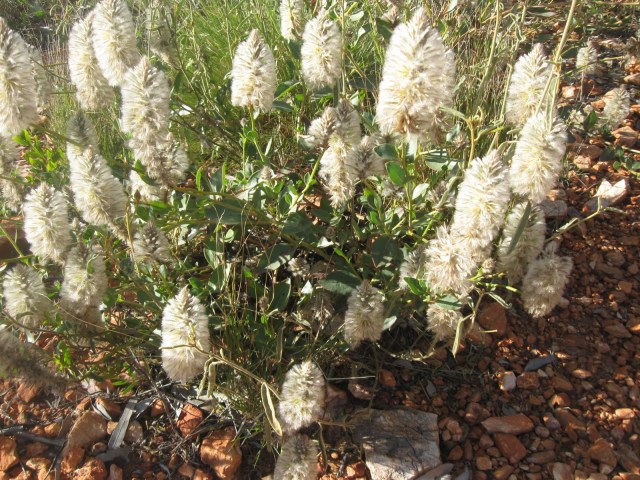 The attractive Desert Rose (Gossypium australe) was flowering around Watarrka, as was the Lantern Bush (Abutilon leucopetalum), and the extremely cute perennial Yellowtail (Ptilotus nobilis) and Green Pussytail (Ptilotus macrocephalus) were everywhere. Trees in the area included Snow Gum (Corymbia aparrerinja), Bloodwood (Corymbia opaca), often covered in flowering Mistletoe, Desert Karrajong (Brachychiton gregorii), and in mulga woodlands True Mulga (Accacia aneura). Finally on my flight into the Alice I could see that much of the rocky hill tops in the MacDonnell Ranges were covered with large area of the red Wild Hop / Rosy Dock (Rumex vesicarius), sadly an introduced species.