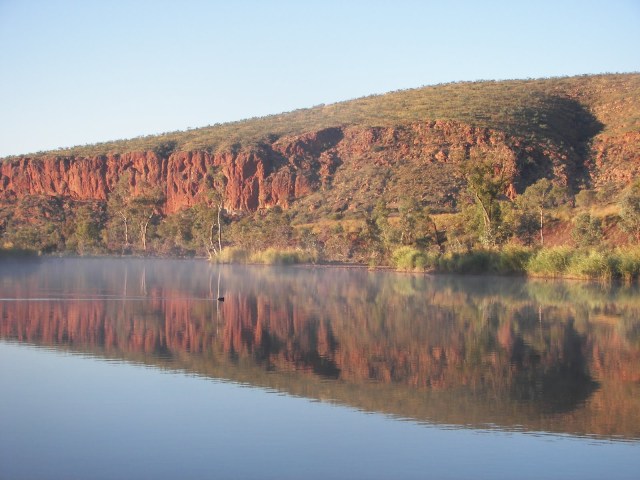 Like the camping ground at Trephina Gorge, the Ormiston Gorge camping site was full, so we headed to the nearby Finke Two Mile Bushcamping Area (you can camp up to 2 km south and downstream of the Trail-head), a fortuitous move, as it proved to be a wonderful camping area overlooking the Fink River. The Fink River (sometimes sited as the oldest river in the world), is usually a string of waterholes; however it was now almost fully flowing. The campsite is accessed by a sandy track on the north side of the hwy – the turn-off is not signposted but is to the north of Namatjira Dr just past Glen Helen Resort – upstream from the Finke River crossing on Namatjira Dr. You will need a 4WD to get to it and there are no facilities, but the feel of the place is hard to beat, and we camped there 2 nights.