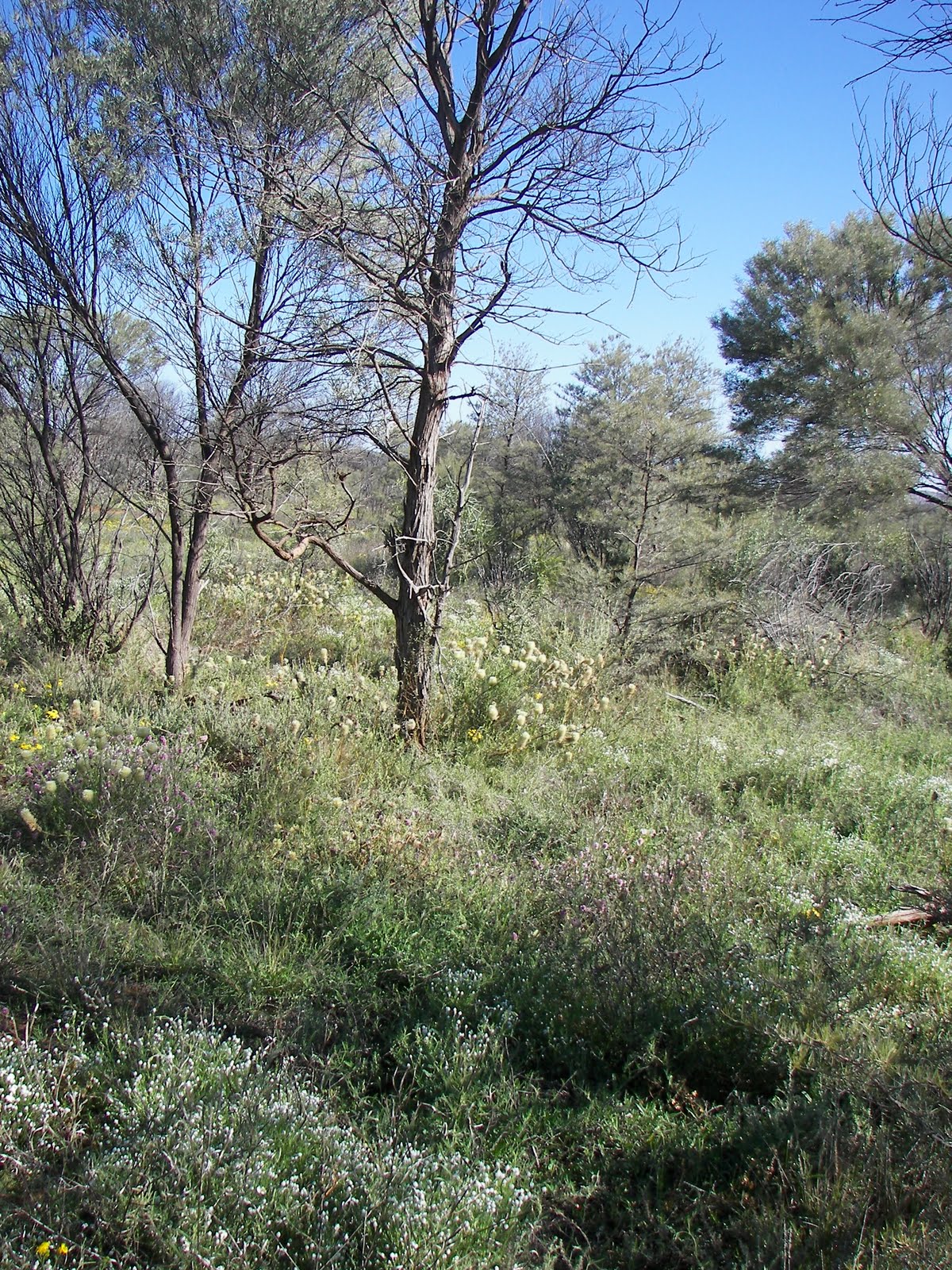 A number of plant species were dominating including Desert Heath-myrtle (Thryptomene maisonneuvei), about 1.5 m high, found mostly on dunes, in masses of densely packed flowers, Button Grass (Dactyloctenium radulans) and Broad-leaf Parakeelya (Calandrinia balonensis),