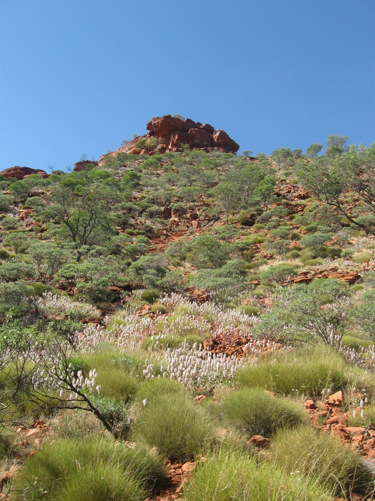The attractive Desert Rose (Gossypium australe) was flowering around Watarrka, as was the Lantern Bush (Abutilon leucopetalum), and the extremely cute perennial Yellowtail (Ptilotus nobilis) and Green Pussytail (Ptilotus macrocephalus) were everywhere. Trees in the area included Snow Gum (Corymbia aparrerinja), Bloodwood (Corymbia opaca), often covered in flowering Mistletoe, Desert Karrajong (Brachychiton gregorii), and in mulga woodlands True Mulga (Accacia aneura). Finally on my flight into the Alice I could see that much of the rocky hill tops in the MacDonnell Ranges were covered with large area of the red Wild Hop / Rosy Dock (Rumex vesicarius), sadly an introduced species.