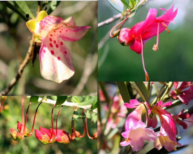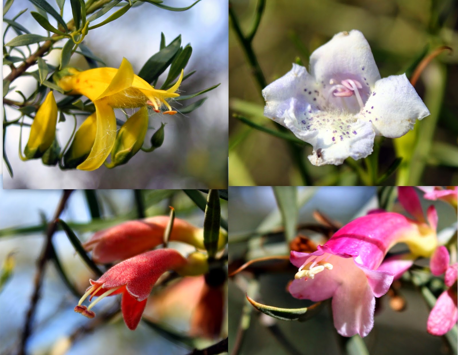 Eremophila at Galore Hill: Spotted Emu-bush (Eremophila maculata) yellow form, Bignonia Emu-bush (E. bignoniiflora), Native Fuchsia (E. latrobii),  Weeooka (E. oppositifolia)