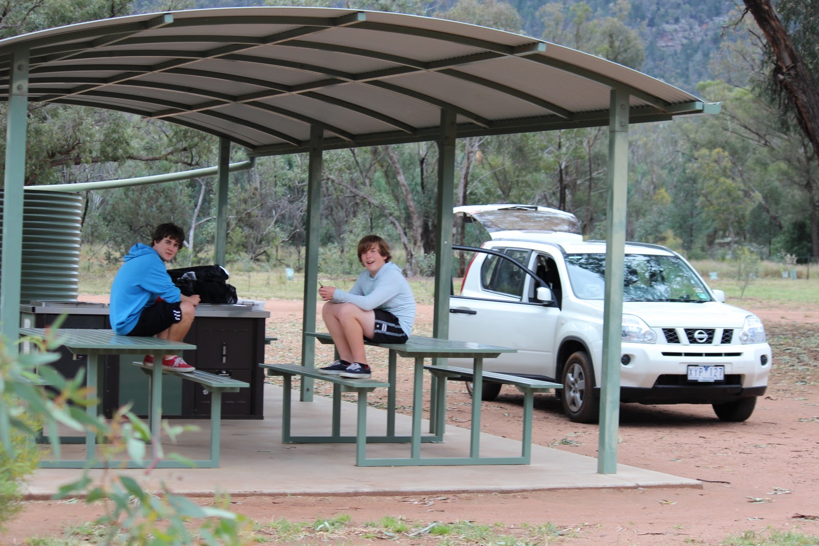 My nephew Zac and son Rhys, both texting at Woolshed Flat