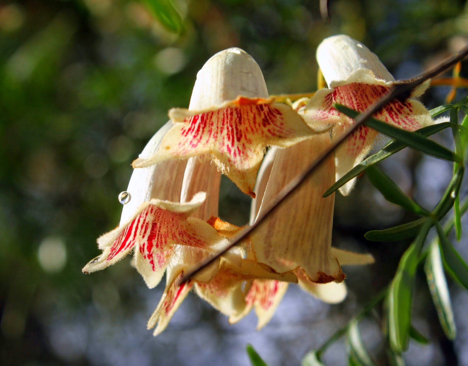 When I visited Cocoparra just a few weeks ago the slopes were covered in Wonga Vine (Pandorea pandorana). A spectacular climber with large white-light red tube flowers about 15mm long, it’s a close relative of the Pandorea jasminoides and the other cultivars that are popular garden plants. At Cocoparra the flowers cascaded from the tops of shrubs and trees along the Mt Brogden walk.  It seems to be a highly variable species, for instance in other places that I’ve seen them they’ve flowered in Spring, however here at Cocoparra this year they were flowering profusely mid-winter. The vines are quite thick, and as a result the wood was used in making spears for woomeras by Australian Aboriginals.