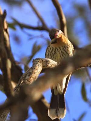 There’s a very pleasant camping area at Woolshed Flat. Around the  campsite and in the surrounding bush I’ve seen Emu, Mulga Parrot, Mallee Ringneck, Blue Bonnet, Spiny-cheeked, Striped, Yellow-plumed and Blue-faced Honeyeater, Noisy and Little Friarbird, Speckled Warbler, Southern Whiteface,  Dusky Woodswallow, Restless Flycatcher, Pallid Cuckoo, Rainbow Bee-eater, White-winged Trilller, Western Gerygone, Restless Flycatcher, and Rufous Songlark, and thornills such as Inland, Chestnut-rumped, Yellow, and Yellow-rumped. I’ve not seen them, but there are occasional sightings of Major Mitchell’s Cockatoo around Woolshed.