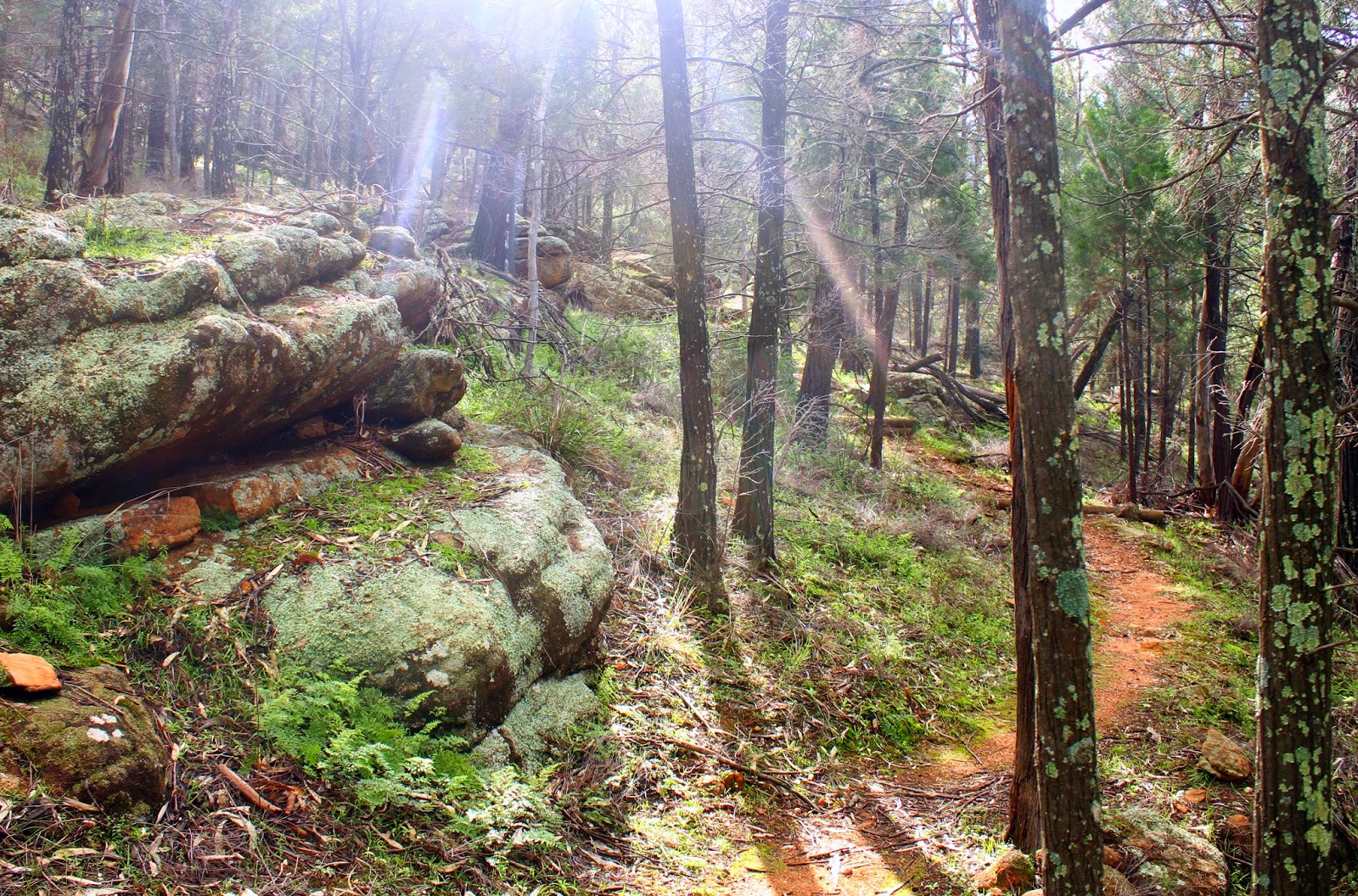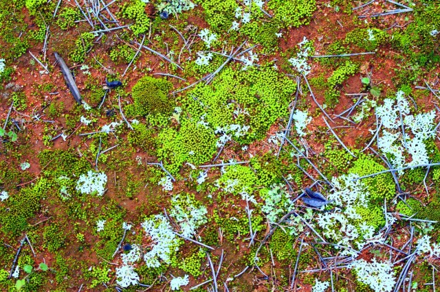A wet winter. Red sandy soil covered with moss and lichen, along the Binya Forest Drive.