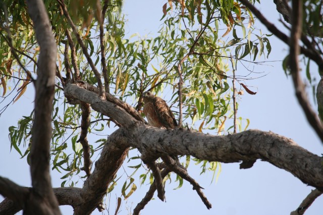 The Darwin Botanical Gardens, located about one and half km from the Darwin CDB, is one of the most reliable places to Rufous Owl. Their favourite roosting site is the trees immediately beside the main toilet block, tending to roost in the large broad trees with an open under-canopy, about 15 m up. If you do not find them, they sometimes found a bit further up the path near the playground, while another spot is the larger open trees along the rainforest walk – look near the pond in the north east section or in the taller trees along the small path at the bottom of the rainforest habitat. If you have difficulty locating them, ask the gardens staff, who usually know their current whereabouts.