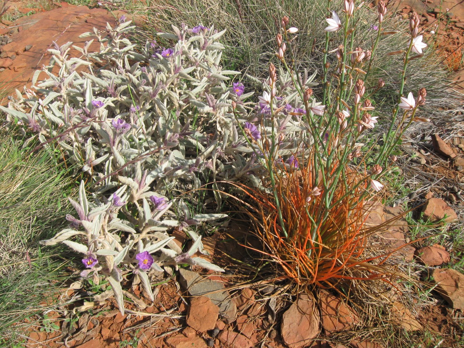 | The three dominant plants at Stokes Hill: Velvet Potato-bush (Solanum ellipticum), Onion Weed (Asphodelus fistulosus), a weed from the Mediterranean, bordered by Spinifex (Triodia pungens). |