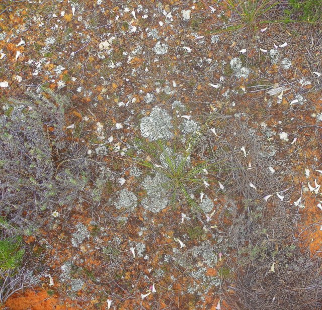 Due to recent rains, the ground surface along both walks was covered with an extremely complex cryptogamic crust. Microscopic plants, such as small mosses, lichens and algae together with slime from bacteria and fungi, formed a fantastic skin-like coating over the ground at Gluepot, literally holding the soil together. Of interest, it is not surprising that the greatest biodiversity on Earth is within 2 cm of the soil surface.