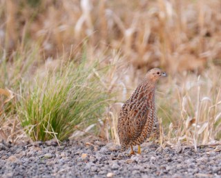 | 1 of 15 Brown Quail feeding along roadside. |
