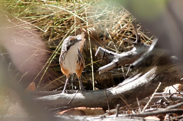 6.6 km from Barkly Hwy: we stopped at a breakaway on the right side of the road and then walked through an area scattered with termite mounds until we reached a Spinifex-dominated landscape 400 m east of the road – near where white quartzite protrudes through the Spinifex. After a bit of searching (mainly listening) we found a family of four Carpentarian Grasswren, providing fantastic views. Everyone commented how the field guides don’t do the bird aesthetic justice, particularly in terms of the rich-rufous coloration. It may be the most attractive of all the grasswren. The birds ran and hoped between clumps of Spinifex and, like other Grasswren I’ve seen, they seemed to have a preference for hanging around tree clusters that acted like small islands in a sea of Spinifex.