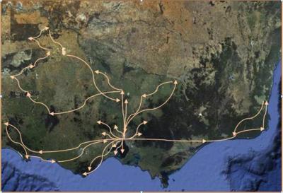 Royal Park, Anakie Gorge, Brisbane Ranges NP, You Yangs SP, WTP, Lake Boga, Goschen FFR, Tresco West FFR, Round Lake, Lake Tyrrell, Greenlake, Reserve, Murray Sunset NP, Mildura Tip (where the Victorian record was broken), Goschen, Lake Boga, Lake Tutchewop, Terrick Terrick NP, Greater Bendigo NP, Otway Ranges NP, Great Ocean Rd, Anglesea Heath, Point Addis, Ironbark Basin, Bellarine Peninsular, Point Lonsdale, You Yangs, WTP, Yielima just north of Nathalia, Barmah SF, Murray River, (Leeton NSW), Tocumwal, DSI Research Station near Rutherglen, Chiltern – Mt Pilot NP, Yarra Bend, Newport Lakes, Bellarine Peninsular, Barwon Heads, Kororoit Creek, Altona CP, Bunyip SF, WTP, Avalon Salt Works, Gray Reserve, Williamstown North, Dunach Nature Conservation Park, and finally back to Northcote.